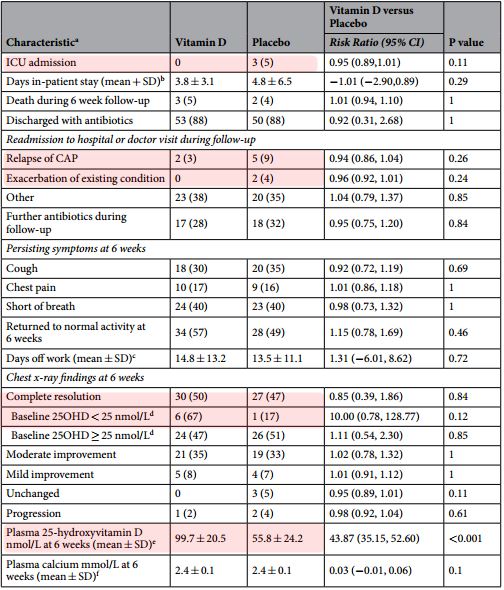 However, there was evidence it increased the complete resolution of pneumonia in participants with baseline vitamin D levels <25 nmol/L (OR 17.0, 95% CI 1.40-549.45, P = 0.043), but this did not reach statistical significance using exact methods (OR 13.0, 95%CI 0.7-960.4, P = 0.083). There were no significant effects for any secondary outcome.