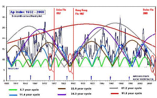 If you overlay influenza epidemics and pandemics on the above solar AP progression it looks like this;<o:p>