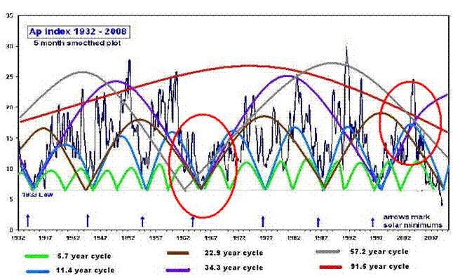 Remember the global cooling scare of the 1970’s? Note how below the multiple solar cycles converged to produce a cooling effect. Then look at the more recent multiple convergence of the cycles at a higher level producing the current global warming scare.<o:p>