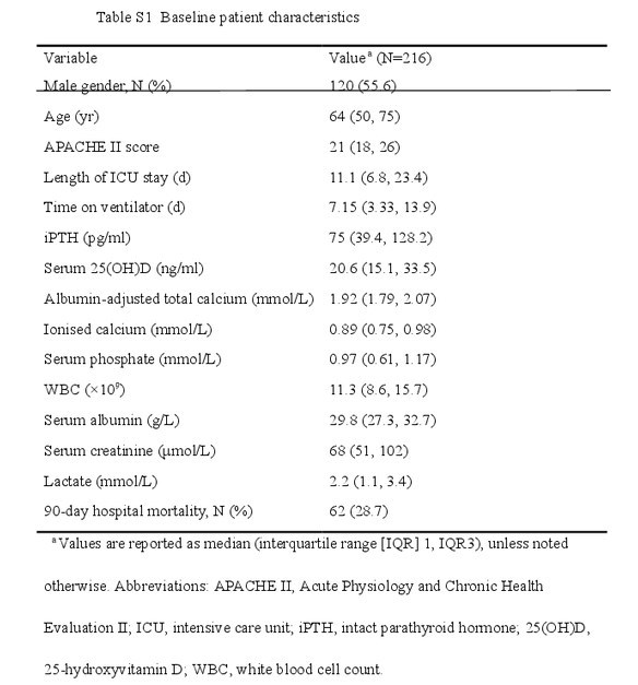 Methods: prospective observational study was conducted on 216 patients admitted to a university-affiliated, tertiary-care medical intensive care unit (MICU) between June 2011 and December 2012. Serum levels of 25-hydroxyvitamin D, ionised calcium and intact PTH were determined within 24 h of MICU admission. The primary end point was all-cause hospital mortality within 90-days of admission.