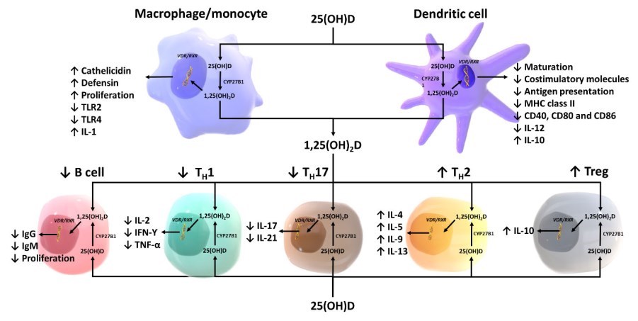 Inactive B lymphocytes have no VDR, and only when they become activated to proliferate by mitogens do they upregulate their VDR expression [66] (Figure 2). Initially, it was found that 1,25(〇H)2D inhibited immunoglobulin synthesis and therefore could potentially be detrimental to the immune system. However, a variety of studies have demonstrated that just as 1,25(〇H)2D modulates T cell function so too does it regulate B-cell activity. When in a hyperactive state, 1,25(〇H)2D appears to dampen the immunoglobulin immune response by a variety of mechanisms. It inhibits plasma cell formation and inducing apoptosis of both activated B cells and plasma cells [67,68]. It also inhibits cytokine-mediated B-cell activation by acting on T-helper cells, directly promotes B-cell anti-inflammatory cytokines production (IL-10, CCR10) and suppresses the differentiation from mature B cells to plasma cells and class-switched memory B cells [66,69,70]. It is believed that, by controlling B-cell activity and B-cell transformation into the plasma cells, 1,25(〇H)2D helps reduce autoantibody production, thereby reducing risk for antibody-mediated autoimmune disorders such as systemic lupus erythematosus [66,71]. It has also been suggested that lymphocytes also have the capacity to generate 1,25(〇H)2D. What is known is that only B lymphocytes can express CYP27B1 and that 25(〇H)D in vitro at 25 times the level of 1,25(〇H)2D can cause similar biologic responses as 1,25(〇H)2D in B lymphocytes [66]. However, there has not been any direct demonstration that B lymphocytes can produce 1,25(〇H)2D.