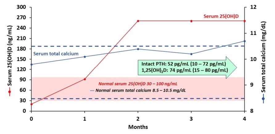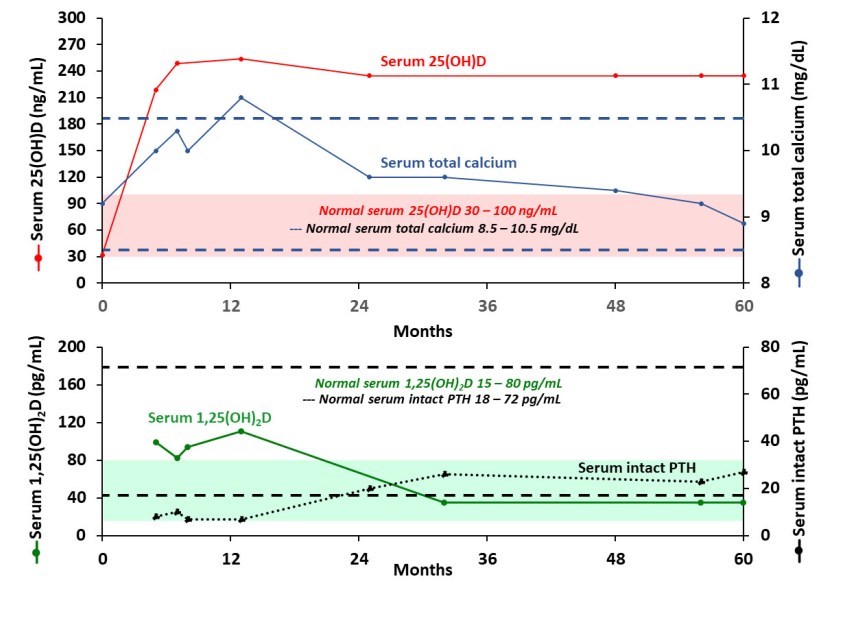 Figure 4. Biochemical measurements of a 32-year-old multiple sclerosis male who received 54,000 international units per day of vitamin D3 for 4 months. Abbreviation: 1,25(OH)2D: 1,25- dihydroxyvitamin D; 25(OH)D: 25-hydroxyvitamin D; PTH: parathyroid hormone. Note: Red solid line represents serum 25-hydroxyvitamin D levels. Blue solid line represents serum total calcium levels. Red highlight represents normal range for serum 25-hydroxytamin D (30-100 ng/mL/75-250 nmol/L). Blue dashed line represents normal range for serum total calcium (8.5-10.5 mg/dL). Normal range for serum intact parathyroid hormone is 10-72 pg/mL. Normal range for serum 1,25- dihydroxyvitamin D is 15-80 pg/mL. Reproduced with permission from Holick MF, copyright 2020.Inflammatory Bowel Diseases