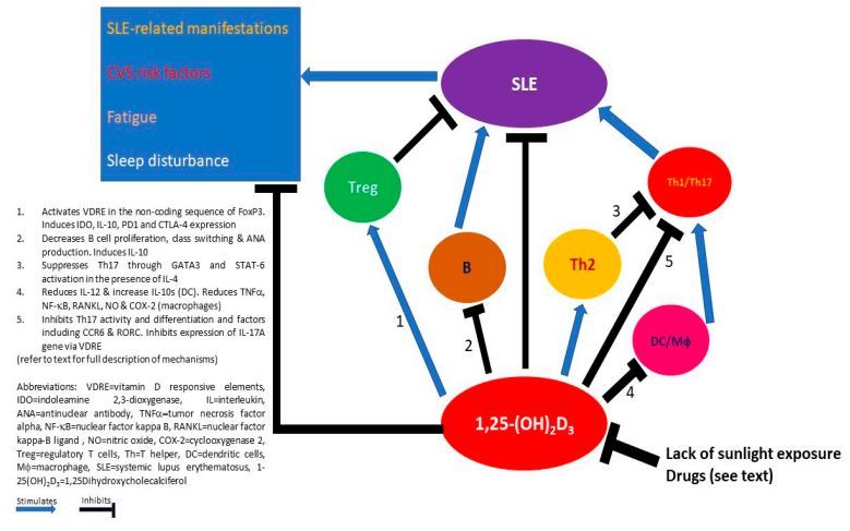 Over the past two decades it has been increasingly recognized that vitamin D, aside from its crucial involvement in calcium and phosphate homeostasis and the dynamics of the musculoskeletal system, exerts its influential impact on the immune system. The mechanistic roles that vitamin D plays regarding immune activation for combating infection, as well as pathologically and mediating autoimmune conditions, have been progressively unraveled. In vitro and in vivo models have demonstrated that the action of vitamin D on various immunocytes is not unidirectional. Rather, how vitamin D affects immunocyte functions depends on the context of the immune response, in the way that its suppressive or stimulatory action offers physiologically appropriate and immunologically advantageous outcomes. In this review, the relationship between various aspects of vitamin D, starting from its adequacy in circulation to its immunological functions, as well as its autoimmune conditions, in particular systemic lupus erythematosus (SLE), a prototype autoimmune condition characterized by immune-complex mediated inflammation, will be discussed. Concurring with other groups of investigators, our group found that vitamin D deficiency is highly prevalent in patients with SLE. Furthermore, the circulating vitamin D levels appear to be correlated with a higher disease activity of SLE as well as extra-musculoskeletal complications of SLE such as fatigue, cardiovascular risk, and cognitive impairment.