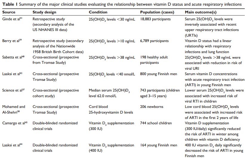 of the Third National Health and Nutrition Examination Survey, and found a strong negative association between serum 25(OH)D3 levels (,30 ng/mL) and risk of upper respiratory tract infection, which seemed to be stronger in individuals with asthma and chronic obstructive pulmonary disease. In a large retrospective study, vitamin D status was found to have a linear association with seasonal infections and lung function, in which each 10 nmol/L increase in 25(OH) D3 was associated with a 7% lower risk of infection and an 8 mL increase in forced expiratory volume in 1 second.39 Several prospective cohort studies in adults and children further demonstrated that serum vitamin D concentration was associated with acute respiratory tract infection (ARTI): 25(OH)D3 levels ,38 ng/mL were associated with increased risk of ARTI.37,40,42 Recently, Mohamed et al38 found that low cord blood 25(OH)D3 levels are associated with increased risk of ARTI in the first 2 years of life, suggesting a necessary early intervention for vitamin D starting from newborns.