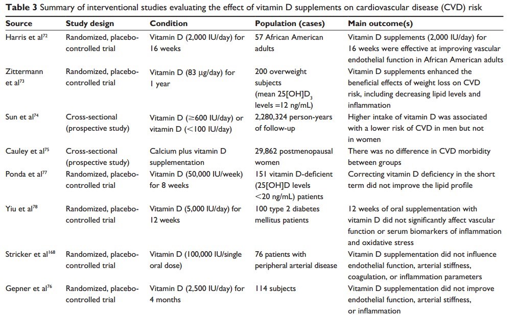 In a hypercholesterolemic swine model, our group has found that vitamin D deficiency significantly increases the expression of TNFa in neointimal lesions after balloon angioplasty and that calcitriol has antiproliferative properties in TNFa-stimulated human VSMCs.85 Besides the direct antiatherogenic effect, vitamin D has a variety of indirect effects on the systemic pathophysiological conditions that promote atherosclerosis, such as improving insulin resistance and hypertension.59 However, Ponda et al17,77 recently reported repletion of 25(OH)D3 levels in the short term does not correct or even ameliorate dyslipidemia, suggesting that the definitive role of vitamin D in CVD remains to be elucidated.Table 3 Summary of interventional studies evaluating the effect of vitamin D supplements on cardiovascular disease (CVD) risk