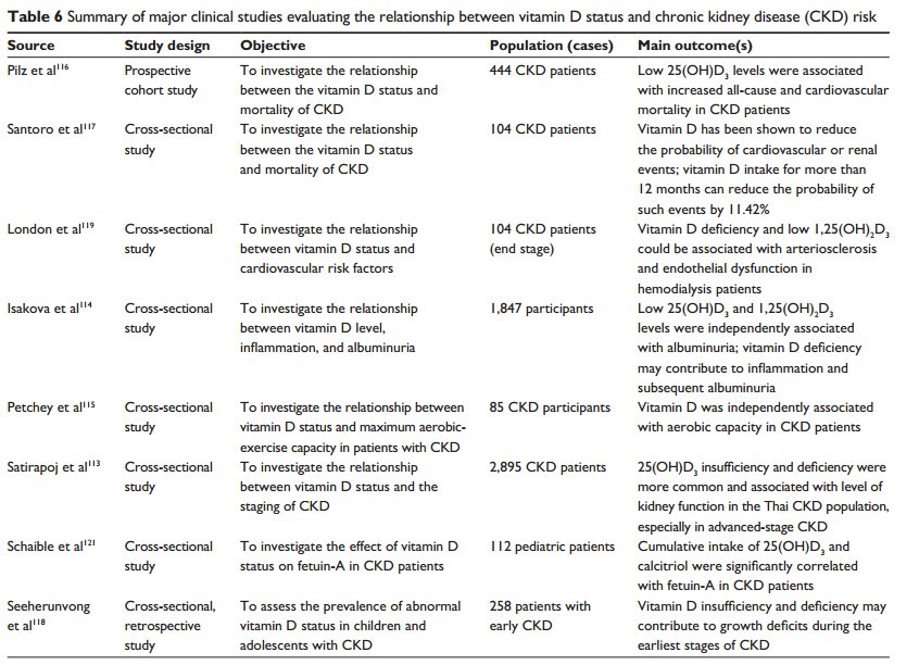 Normal renal function is crucial for vitamin D metabolism.1 Vitamin D deficiency is highly prevalent among patients with chronic kidney disease (CKD; 20%-85%).112,113 Studies have demonstrated a strong association between vitamin D deficiency and increased all-cause and CKD mortality in the general population (Table 6).113-118 Chronic low-grade inflammation is a hallmark of CKD, and has been disclosed as one important factor contributing to the progression of CKD and high cardiovascular mortality.10 A prospective cohort study of444 patients with eGFR <60 mL/min/1.73 m2 (follow-up time 9.4 years) showed that most patients died from cardiovascular causes.116 Cox proportional hazard modeling has shown multivariate-adjusted HRs (with 95% confidence intervals) in severely vitamin D-deficient (25[OH]D3 <10 ng/mL) compared to vitamin D-sufficient patients (25[OH]D3 $30 ng/mL) were 3.79 (1.71-8.43) for all-cause and 5.61 (1.89-16.6) for cardiovascular mortality, suggesting low 25(OH)D3 levels are a crucial factor linking CKD to CVD.116 Another cross-sectional study strengthened this evidence, demonstrating that higher vascular stiffness and endothelial dysfunction were associated with low levels of 25(OH) D3 and 1,25(OH)2D3 in CKD patients.119 Vitamin D intake for more than 12 months can significantly reduce the probability of cardiovascular events.117 Low 25(OH)D3 and 1,25(OH)2D3 levels are independently associated with albuminuria, a major risk factor for the progression of renal disease linked to all-cause mortality and cardiovascular mortality.114 Treatment with active vitamin D preparations also has a beneficial effect in decreasing albuminuria.120 Besides regulating inflammation and proteinuria, vitamin D has been found to improve aerobic capacity and increase the level of fetuin-A, an important protective factor for cardiovascular morbidity in pediatric CKD patients.115,121