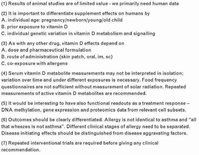 To solve these vexing questions, we probably need a shift in research priorities[43] away from observational studies and study parameters of limited use. The plethora of positive associations of serum 25-hydroxy-vitamin D and cardiovascular disease have only recently been decided by a controlled trial.[44] We probably do not need any further observational studies in allergy research but randomized clinical trials of vitamin D supplements, starting in pregnancy and extending over the newborn period with final outcomes measured at later ages (Fig. 1). There are also numerous biological readouts that could accompany those trials to identify biological pathways using DNA methylation, gene expression pattern or proteomics data from relevant cell subsets. Such trials could ultimately show everything about vitamin D[45] to get the most benefit for the health of our children.