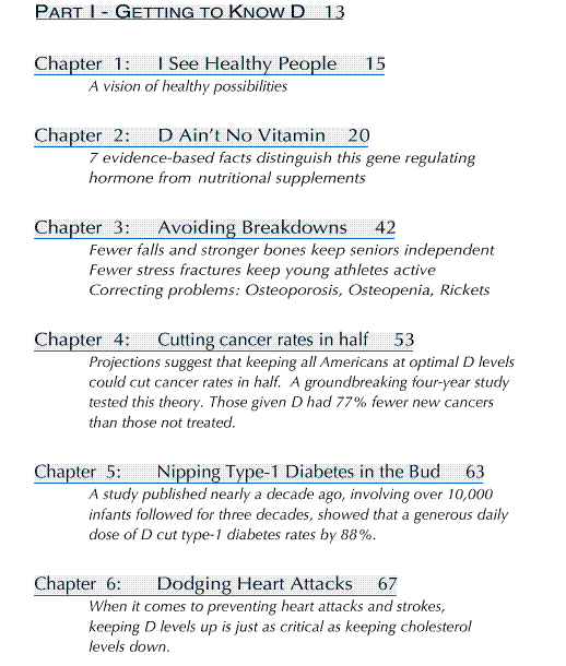 pg 23 - Keebler addresses the readers skepticism directly: "Our degree of skepticism about a nutrient grows in direct proportion to the number of diseases it is purported to "cure". After all, snake oil was alleged to cure everything. So when I tell you that optimal level of D may prevent over 40 diseases, you 'skeptometer is likely to enter the red zone. Ans when I mention taking 10 to 50 times more D than the government says you need, your brain may flash warnings of a potentially dangerous fad."