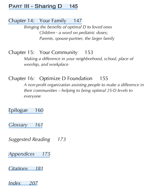 Using a warm, conversational style, Dr. Keebler takes the hard, cold facts of one groundbreaking study after another, invigorates them using patient stories, and makes them pertinent to your life. Clear, evidence-based guidelines make it easy for you and your health care practitioner to have you on the road to optimal health. Dr. Keebler shows how simple guidelines are applied in real life situations using patients with an assortment of health issues. Helpful hints are given on choosing the best form of D and how to take it. Pediatric guidelines and guidelines for pregnancy and nursing are included. Safety issues are covered including potential complications of D replacement and the challenges of using sun exposure for optimizing D levels. Finally, you are invited to share your D knowledge with others and to join the national effort to achieve optimal D levels for everyone by 2020.