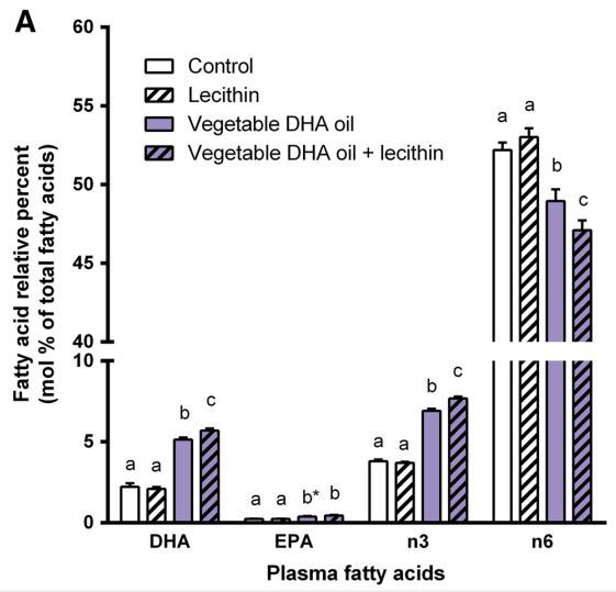 Crude lecithin, a mixture of mainly phospholipids, potentially helps to increase the systemic availability of dietary omega-3 polyunsaturated fatty acids (n-3 PUFA), such as docosahexaenoic acid (DHA). Nevertheless, no clear data exist on the effects of prolonged combined dietary supplementation of DHA and lecithin on RBC and plasma PUFA levels. In the current experiments, levels of DHA and choline, two dietary ingredients that enhance neuronal membrane formation and function, were determined in plasma and red blood cells (RBC) from rats after dietary supplementation of DHA-containing oils with and without concomitant dietary supplementation of crude lecithin for 2-3 weeks. The aim was to provide experimental evidence for the hypothesized additive effects of dietary lecithin (not containing any DHA) on top of dietary DHA on PUFA levels in plasma and RBC. Dietary supplementation of DHA-containing oils, either as vegetable algae oil or as fish oil, increased DHA, eicosapentaenoic acid (EPA), and total n-3 PUFA, and decreased total omega-6 PUFA levels in plasma and RBC, while dietary lecithin supplementation alone did not affect these levels. However, combined dietary supplementation of DHA and lecithin increased the changes induced by DHA supplementation alone. Animals receiving a lecithin-containing diet also had a higher plasma free choline concentration as compared to controls. In conclusion, dietary DHA-containing oils and crude lecithin have synergistic effects on increasing plasma and RBC n-3 PUFA levels, including DHA and EPA. By increasing the systemic availability of dietary DHA, dietary lecithin may increase the efficacy of DHA supplementation when their intake is combined.