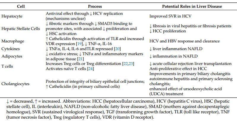 Hepatocytes isolated from humans, rats, and mice express little or no VDR mRNA and protein [16,17]. On the other hand, non-parenchymal cells, including hepatic stellate cells (HSCs), sinusoidal endothelial cells, and Kupffer cells (KCs), strongly express VDR [18], and these probably mediate vitamin D effects in the non-diseased state. However, levels of VDR in hepatocytes increase with inflammation, giving a broader site for potential targets. Levels also increase in HSCs and KCs with inflammation, and several immune functions of VDR described in other tissues may also be involved in liver disease (Table 1).