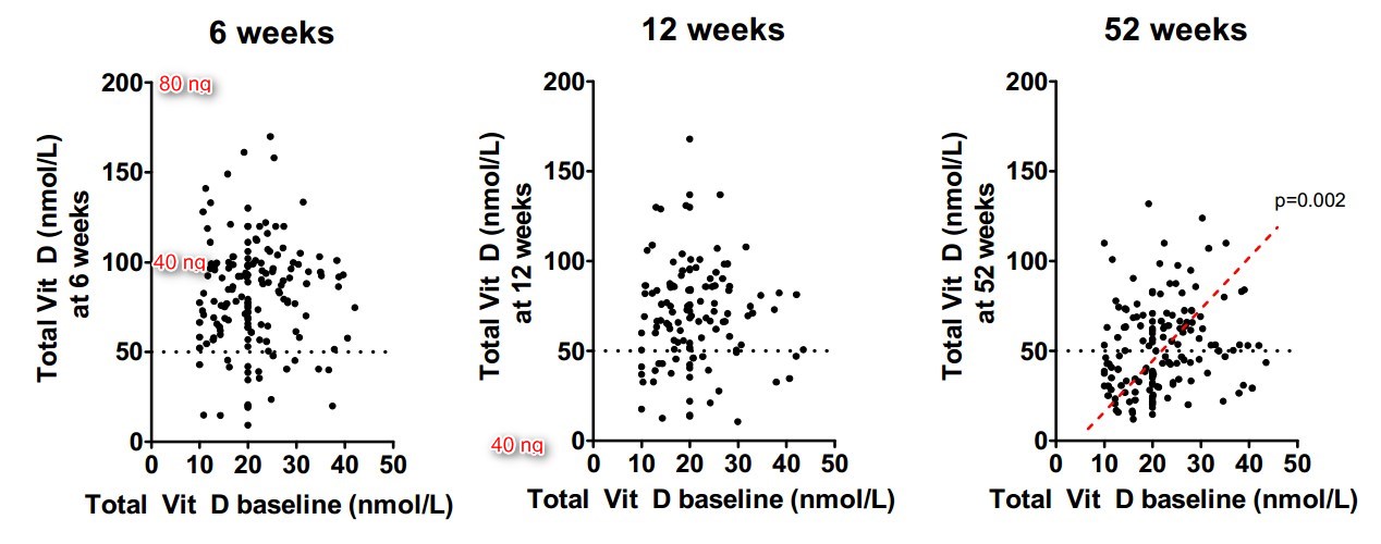 Method: All patients who received observed loading dose of colecalciferol for a 1-year period were included. Demographic, clinical, and biochemical data was collected from existing databases and clinical notes.