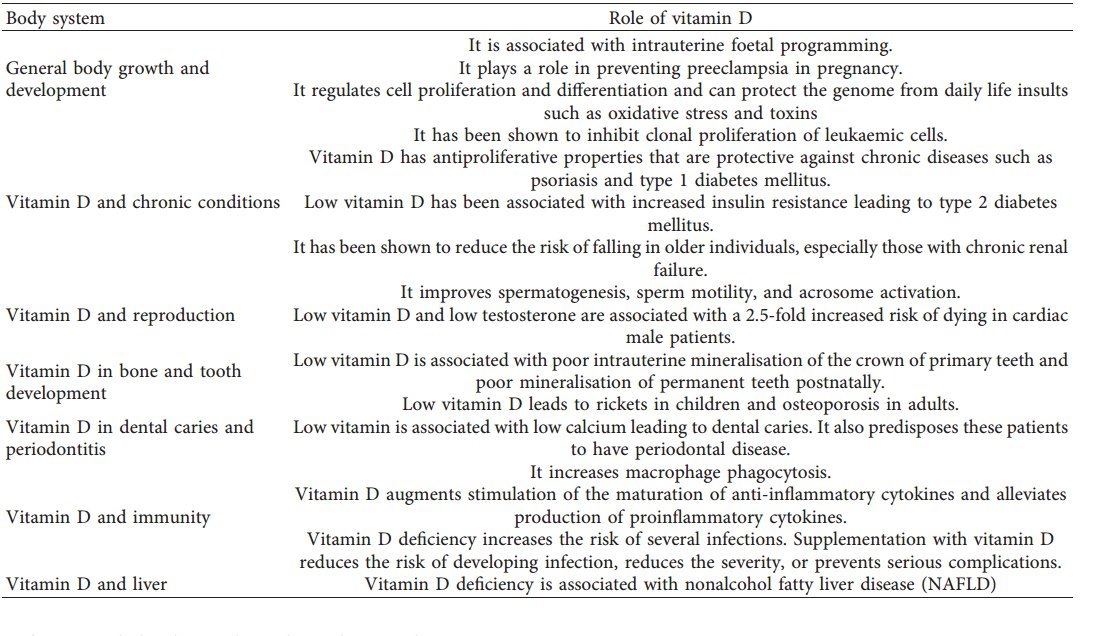 Vitamin D is an important hormone that is known for the regulation of calcium and phosphate metabolism. Vitamin D deficiency leads to rickets in children and osteoporosis in adults leading to poor bone mineralisation and can also lead to serious dental complications in the same population. Recent studies have shown vitamin D to work as a hormone needed not only in bone and teeth but also in other body organs from intrauterine life up to old age. It has been demonstrated that Vitamin D has various effects on biological processes that deal with cell growth, differentiation, cell death, immune regulation, DNA stability, and neuronal growth. Despite being readily formed in the body through the intervention of the sun, patients are still found to have low vitamin D levels. We review studies done to show how vitamin D works.