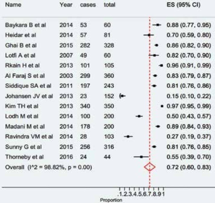 Results: Fourteen studies (6 were CC, 6 CS, and 2 cohort) involving 2602 patients were included in the final analysis. The WPPR (95% CI) of hypovitaminosis D in patients with LBP was found to be 0.72 (0.60-0.83). Marked heterogeneity was observed, median quality score of all studies was 7.5 interquartile range (IQR) (6.2 - 8.7) on a scale of 0 to 11. Sensitivity analysis showed robustness of the results. The WPPR of hypovitaminosis D was lower in CS at 0.60 (0.35-0.85) as compared to CC studies at 0.81 (0.72-0.90) (P < 0.01). The WPPR was lower in men at 0.74 (0.63-0.86) as compared to women at 0.84 (0.78-0.89) (P < 0.01). No publication bias was observed.