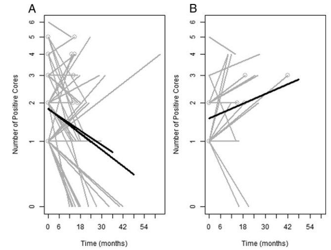 FIG. 4. Trajectories of number of positive cores over time in subjects supplemented with vitamin D3