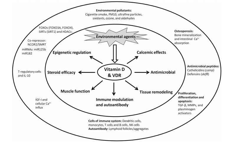Vitamin D deficiency is linked to accelerated decline in lung function, increased inflammation, and reduced immunity in chronic lung diseases. Epidemiological studies have suggested that vitamin D insufficiency is associated with low lung function in susceptible subjects who are exposed to higher levels of environmental agents (airborne particulates). Recent studies have highlighted the role of vitamin D and vitamin D receptor (VDR) in regulation of several genes that are involved in inflammation, immunity, cellular proliferation, differentiation, and apoptosis. Vitamin D has also been implicated in reversal of steroid resistance and airway remodeling, which are the hallmarks of chronic obstructive pulmonary disease (COPD) and severe asthma. VDR protein level is decreased in lungs of patients with COPD. VDR deficient mice develop an abnormal lung phenotype with characteristics of COPD, such as airspace enlargement and decline in lung function associated with increased lung inflammatory cellular influx, and immune-lymphoid aggregates formation.