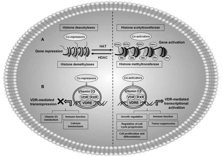Dietary vitamin D may regulate epigenetic events, in particular on genes which are responsible for COPD susceptibility. Active metabolite of vitamin D, 1,25-dihydroxyvitamin D(3) plays an essential role in cellular metabolism and differentiation via its nuclear receptor (VDR) that cooperates with several other chromatin modification enzymes (histone acetyltransferases and histone deacetylases), thereby mediating complex epigenetic events in vitamin D signaling and metabolism.