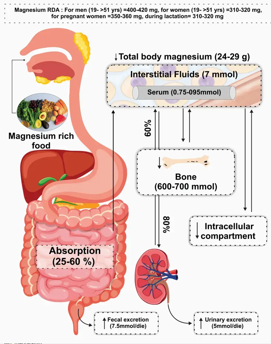 Magnesium (Mg), an essential mineral vital for human health, is involved in a myriad of physiological processes fundamental to the proper functioning of the body. Its importance extends across multiple organ systems, including the cardiovascular, musculoskeletal, and nervous systems, highlighting its indispensable role in maintaining overall well-being. Despite its significance, Mg deficiency remains a global health concern, with widespread implications for public health. Mg stands as the preeminent divalent intracellular cation within human cells, trailing only potassium (K) in abundance. With an atomic weight of 24.305 g/mol and an atomic number of 12, mg is indispensable for a plethora of biological processes, encompassing oxidative phosphorylation, energy production, glycolysis, and the synthesis of proteins and nucleic acids [1].