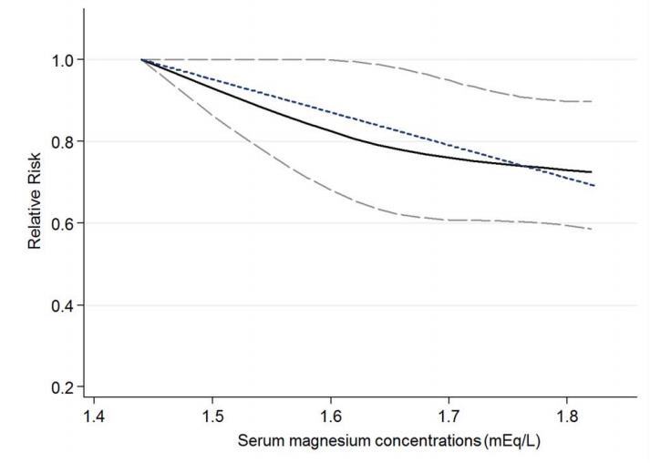 The pooled relative risks of total CVD events for the highest vs. lowest category of dietary magnesium intake and serum magnesium concentrations were 0.85 (95% confidence interval 0.78 to 0.92) and 0.77 (0.66 to 0.87), respectively. In linear dose-response analysis, only serum magnesium concentrations ranging from 1.44 to 1.8 mEq/L were significantly associated with total CVD events risk (0.91, 0.85 to 0.97) per 0.1 mEq/L (Pnonlinearity = 0.465). However, significant inverse associations emerged in nonlinear models for dietary magnesium intake (Pnonlinearity = 0.024).