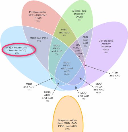 Venn diagram (overlap) of MDD with PTSD, Alcohol Use Disorder and Anxiety