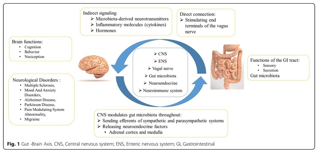 The present review article aims to discuss the direct and indirect evidence suggesting relationships between migraine and the gut-brain axis. However, the mechanisms explaining how the gut and the brain may interact in patients with migraine are not entirely clear. Studies suggest that this interaction seems to be influenced by multiple factors such as