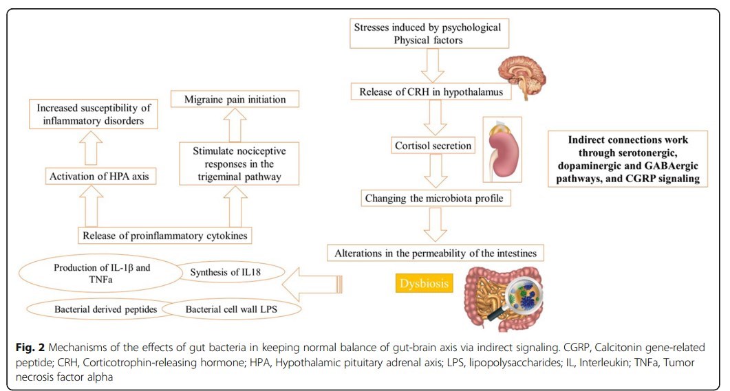 Neuropeptides including CGRP, SP, VIP, NPY are thought to have antimicrobial impact on a variety of the gut bacterial strains and thus speculated to be involved in the bidirectional relationship between the gut and the brain. According to the current knowledge, migraine headache in patients harboring HP might be improved following the bacteria eradication.