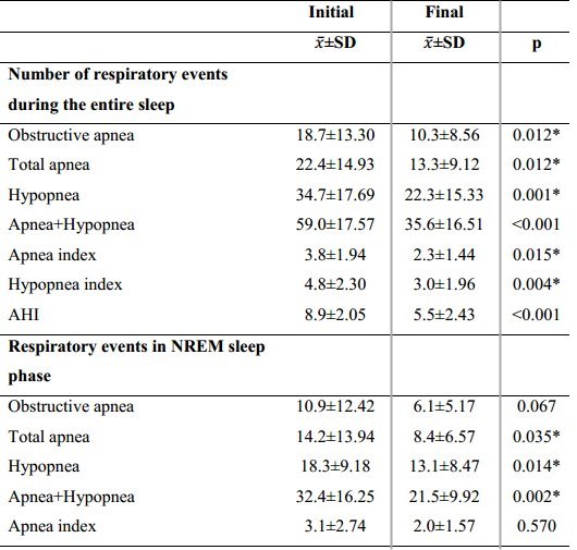 Materials and methods: Nineteen adult male individuals(18-65 years) who were diagnosed with mild OSAS after polysomnography and had low vitamin D levels were included in the study. Each week, patients took 50.000 IU Vitamin D3 supplementation for 8 weeks. Polysomnography, biochemical parameters FBG (fasting blood glucose), lipid profile (TG, TC, LDL-C, HDL-C, VLDL-C), calcium, phosphorus, parathormone, calcitonin, serum 25(OH)D, insulin, CRP, TNF-?, IL-6 and IL-10 of patients were evaluated at the beginning of study and at the end of the study. All assessments, including polysomnography, were repeated after 8 weeks.