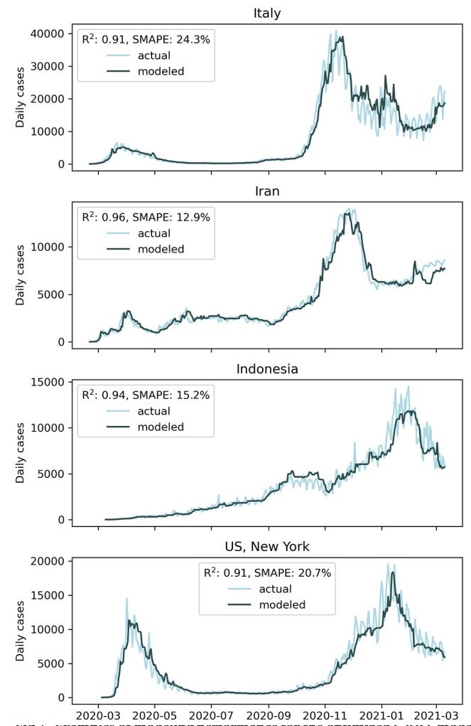 Charts of model vs actual COVID for various countries and cities