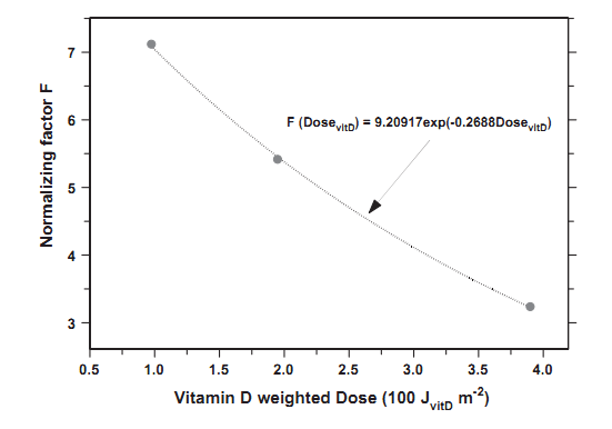 F(t) = 9.20917 exp[-0.2688EE(t)] (3) in nmolL-1 per SDD, where EE(t) = (UV(t)) EF(t) is the effective exposure (in SDD), incident on the body. Fig. 3 shows that the formula fits the experimental data quite well.