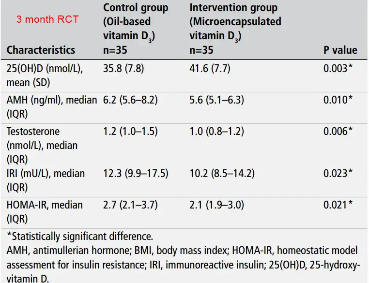 Results: Significantly increased serum levels of 25(OH)D were observed in patients supplemented with the microencapsulated form of vitamin D3 in the third month from the beginning of therapy, compared with the control group (p=0.003). In the microencapsulated vitamin D group, there was a decrease in IRI serum levels (p=0.023), HOMA-IR (p=0.021), serum AMH (p=0.010) and testosterone levels (p=0.006). The fasting plasma glucose levels did not change significantly.