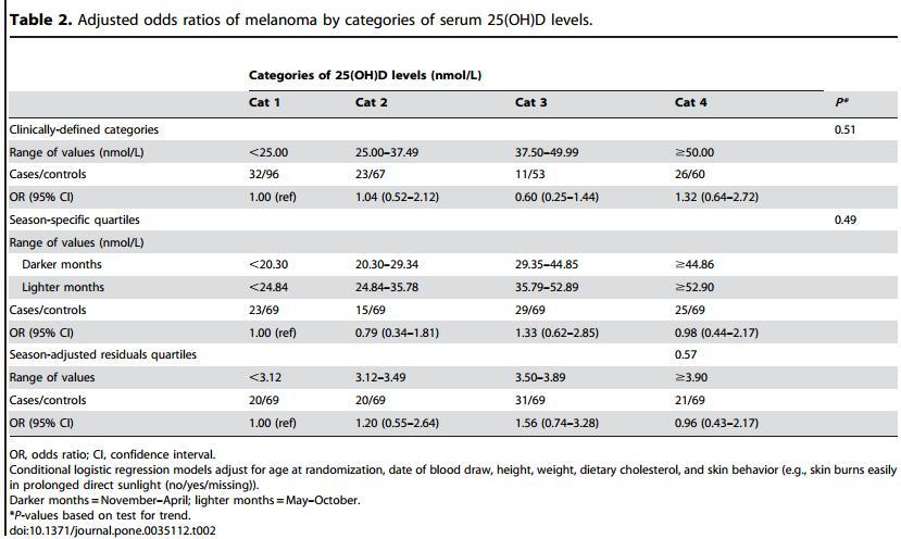 Overall no association of serum 25(OH)D and melanoma risk was observed.