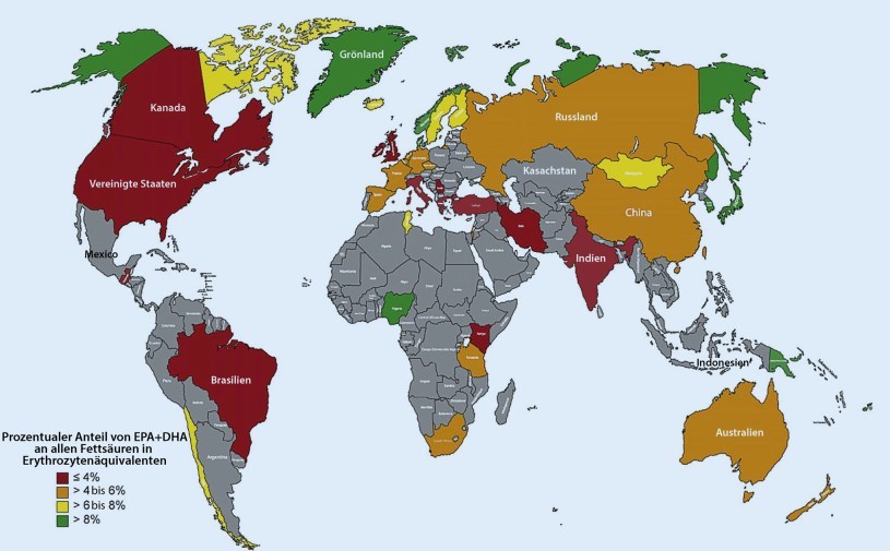 Dieser Mangel wurde durch Messen des prozentualen Anteils von EPA+DHA in Erythrozyten (Omega-3-Index) in zahlreichen Ländern erkannt ([42]; O Abb. 1). Der Omega-3-Index wird standardisiert mit der Methode des HS- Omega-3 Index® (Omegametrix, Martinsried, Deutschland) erfasst, der die mit Abstand breiteste wissenschaftliche Datenbasis aller Messverfahren hat (z.B. [6, 10, 14, 15, 18, 19, 21, 22, 26, 36-39]). Da EPA+DHA in Erythrozyten mit EPA+DHA in allen anderen bisher untersuchten Zellen korreliert, ist de