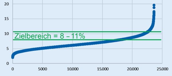 Abb.2 8 Omega-3-Index in 23.615 Erythrozytenprobenin Europa, gemessen mit der HS-Omega-3- Index®-Methode (Omegametrix, Martinsried, Deutschland). Ergebnisse <2 % fanden sich nicht, ebensowenig Ergebnisse >20%. n (<8%) = 17.984(76,15%); n (imZielbereich) = 4831 (20,45%); n (> 11%) = 799 (3,38%)