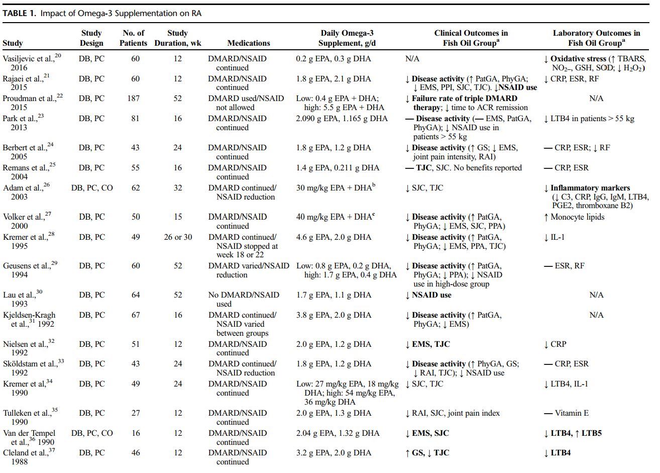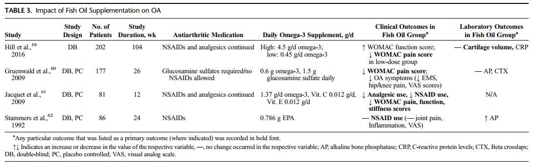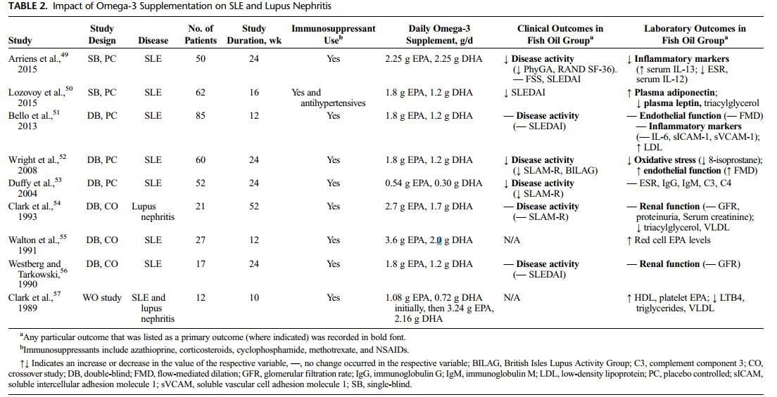 Download the PDF from VitaminDWikiMany clinical trials of omega-3 fatty acids, supplied as fish oil supplements, have been carried out in rheumatoid arthritis (RA), systemic lupus erythematosus (SLE), lupus nephritis, and osteoarthritis (OA) over the past 3 decades. This review attempts to summarize the highlights of these studies to evaluate the clinical efficacy for omega-3 fatty acids to be added alongside existing treatment regimens.