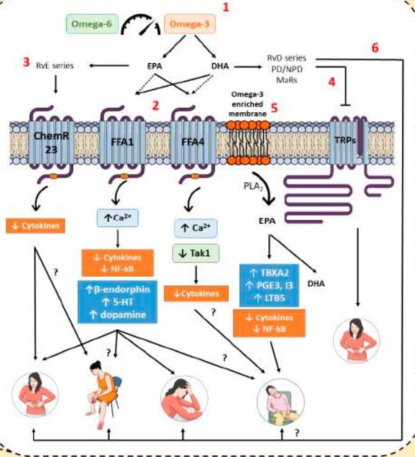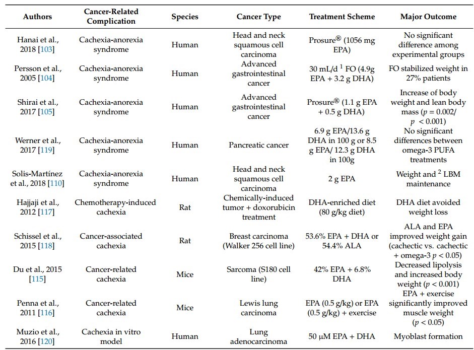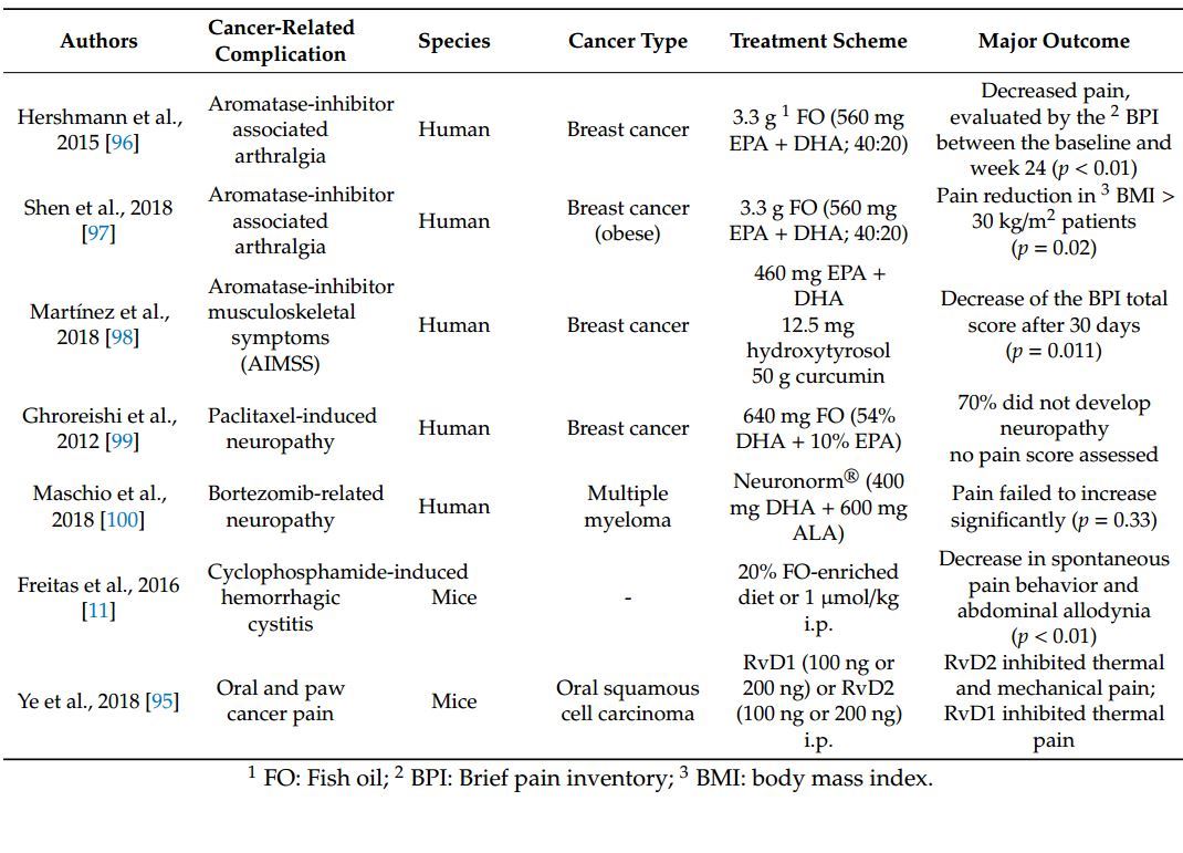 Omega-3 polyunsaturated fatty acids (PUFAs) are considered immunonutrients and are commonly used in the nutritional therapy of cancer patients due to their ample biological effects. Omega-3 PUFAs play essential roles in cell signaling and in the cell structure and fluidity of membranes. They participate in the resolution of inflammation and have anti-inflammatory and antinociceptive effects. Additionally, they can act as agonists of G protein-coupled receptors, namely, GPR40/FFA1 and GPR120/FFA4.