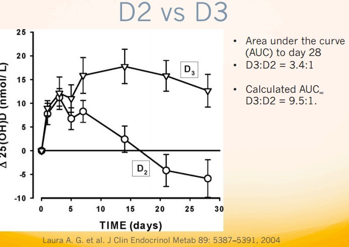- Better response by D3 to injection or tablet, even when giving 2X more D2 than D3