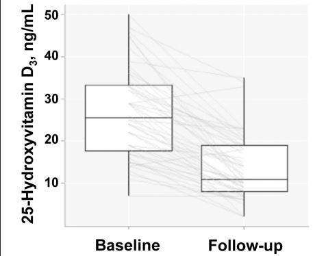 In the group receiving vitamin D2. . . . 25(OH)D3 concentration fell from 36.4 ± 13.3 nmol/L at baseline to 16.6 ± 6.3 nmol/L after 8 weeks (P < .01)