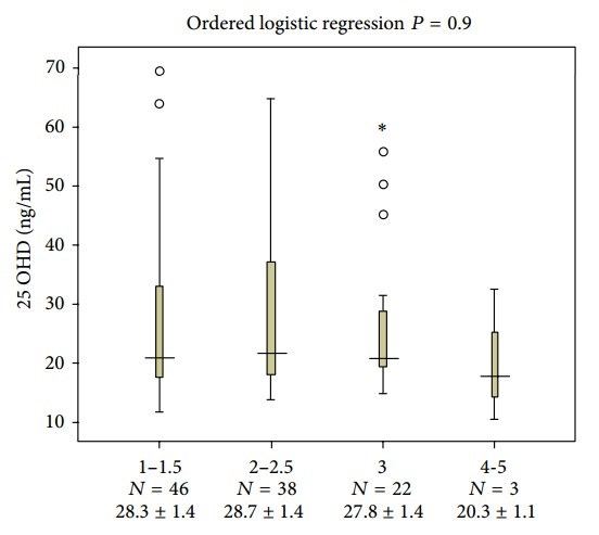 Methods. In 109 patients, the severity of PD was evaluated by using Hoehn & Yahr (HR) stages and Unified Parkinson's Disease Rating Stage (UPDRS) Part III compared with 25OHD level in a double-blind and cross-sectional study.