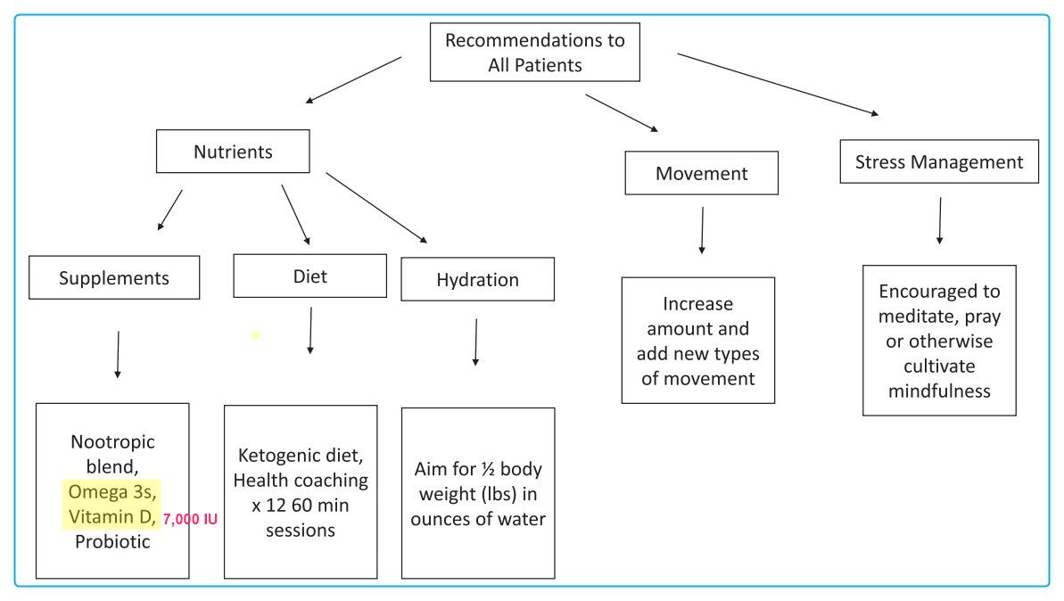 Participants (n = 34) were recruited from the San Diego, CA area. The multimodal intervention included lifestyle changes (i.e., movement, diet, and stress management), nutraceutical support, and medications. It was delivered pragmatically over four clinical visits, and outcome measures were gathered at four study visits, occurring at baseline, one, three, and six months (primary endpoint). Study participants received weekly phone calls for nutrition support throughout study participation. Outcome measures included the Cambridge Brain Sciences (CBS) battery, and the Montreal Cognitive Assessment (MoCA).