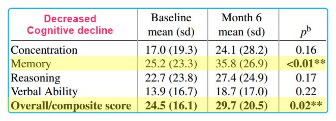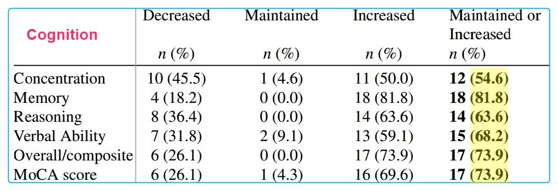 At 6 months, mean MoCA scores improved from 19.6±3.1 to 21.7±6.2 (p = 0.013). Significant improvement was observed in mean scores of the CBS memory domain [25.2 (SD 23.3) to 35.8 (SD 26.9); p < 0.01] and CBS overall composite cognition score [24.5 (SD 16.1) to 29.7 (SD 20.5); p = 0.02]. All CBS domains improved.