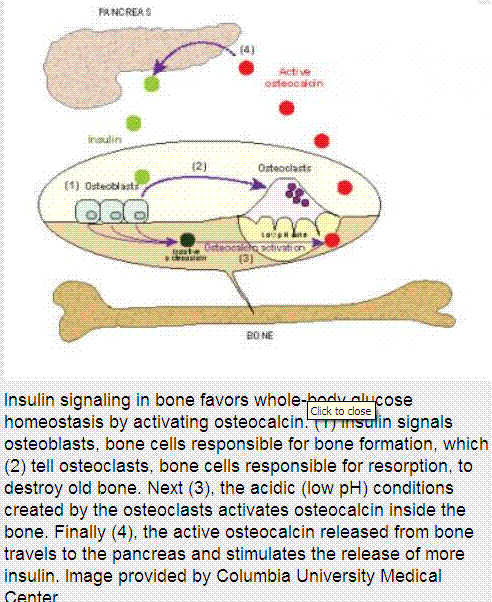 By identifying the tight connection existing between energy metabolism and skeleton physiology - in this case between insulin and osteocalcin - this new study further underscores the wealth of physiological function exerted by the skeleton. The finding further strengthens the idea that diabetes could be treated by increasing the level of osteocalcin in the body. In addition, the researchers suggested that since most drugs to treat another condition - osteoporosis - work by inhibiting bone resorption, the drugs may decrease the activation of osteocalcin and cause glucose intolerance in some patients.