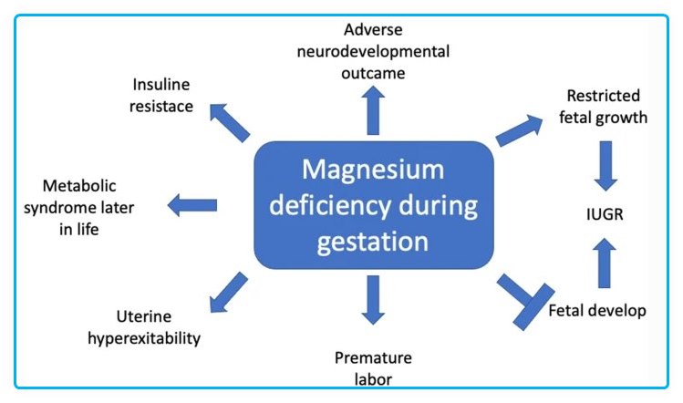 Dalton LM1, Ní Fhloinn DM1, Gaydadzhieva GT1, Mazurkiewicz OM1, Leeson H1, Wright CP2.Magnesium deficiency is prevalent in women of childbearing age in both developing and developed countries. The need for magnesium increases during pregnancy, and the majority of pregnant women likely do not meet this increased need. Magnesium deficiency or insufficiency during pregnancy may pose a health risk for both the mother and the newborn, with implications that may extend into adulthood of the offspring. The measurement of serum magnesium is the most widely used method for determining magnesium levels, but it has significant limitations that have both hindered the assessment of deficiency and affected the reliability of studies in pregnant women. Thus far, limited studies have suggested links between magnesium inadequacy and certain conditions in pregnancy associated with high mortality and morbidity, such as