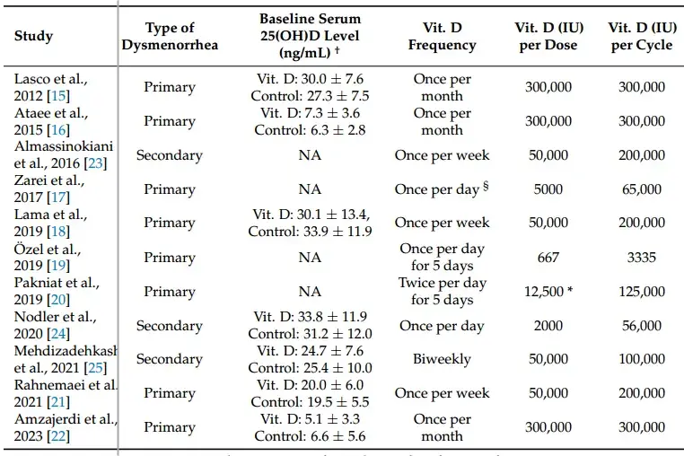 In conclusion, although substantial heterogeneity persists, vitamin D supplementation decreased pain intensity in patients with dysmenorrhea, especially in those with primary dysmenorrhoea.