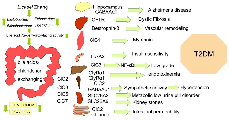 In conclusion, L. casei Zhang may be able to improve the onset and development of glycemia by rapidly altering gut microbiota. The short-term response to probiotic-altered microbiota may result in a chloride ion influx in multiple organs before chronic inflammation occurs. Moreover, tissue chloride ion loss and related genes suppression linked T2DM pathogenesis to its comorbid medical conditions/diseases (Fig. 6). Future studies will need to address the precise mechanisms involved in the bile acids-chloride ion exchange.