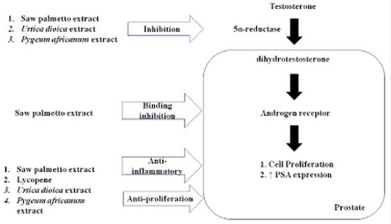Summary: The pharmacological effects of plant extracts in the treatment of BPH.Name Main mechanisms of action Saw Palmetto extraction 5α-reductase inhibition; blockage androgen receptors; anti-proliferation; anti-inflammatory activity; prostate smooth muscle relaxation; Lycopene (tomatoe) 5α-reductase inhibition;; anti-proliferation; anti-inflammatory; anti-oxidant activity Urtica dioica extract (Stinging nettel root WEAK 5α-reductase inhibition; Decreased action of sex hormones; Pygeum africanum extract 5α-reductase inhibition;; anti-inflammatory activity