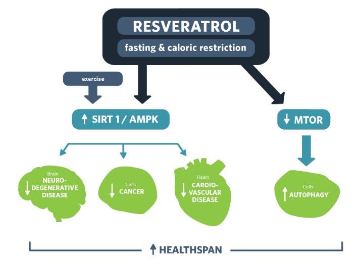Resveratrol activates SIRT1 and AMPK while suppressing mTOR, which may lead to improved healthspan via mechanisms that overlap with caloric restriction.Patients characterized as having non-alcoholic fatty liver disease who took a resveratrol supplement of either 300 or 500 milligrams per day for three months exhibited decreased serum LDL levels, decreased hepatic steatosis, decreased inflammation markers such as NF-κB, and improved insulin sensitivity.[9] [10]