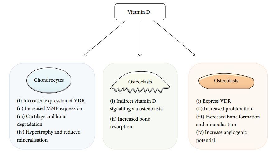Chondrocytes are the cell type responsible for the production and maintenance of the extracellular matrix (ECM) in cartilage. In OA, imbalances in the anabolic and catabolic processes result in the destruction and loss of articular cartilage ultimately leading to the progression of OA. Articular cartilage in the knee is typically avascular and receives nutrients and growth factors primarily from the synovial fluid. Additionally, chondrocytes exist in a relatively low cell density and as a result ECM production and repair is a slow process. Hypertrophic and proliferating chondrocytes express VDR [45, 46] and osteoarthritic chondrocytes more so than healthy cells [61, 62]. Additionally, the presence of VDR expression is associated with MMP expression, specifically MMP-1, MMP-3, and MMP-9. MMPs enzymatically degrade bone and cartilage, which is disadvantageous in OA. Chondrocytes have been shown to directly regulate osteoclastogenesis through VDR signalling leading to the induction of RANKL expression [63]. Furthermore, 1α,25(OH)2D3 and inorganic phosphate are involved in the hypertrophy and impaired mineralisation in osteoarthritic chondrocytes by activating extracellular-signal-regulated kinase (ERK)1/2 through FGF-23 signalling [62]. From these reports, it appears that vitamin D has negative effects on OA cartilage health. Future research should aim to investigate the extent and severity of these actions and their implications on the development and progression of OA.