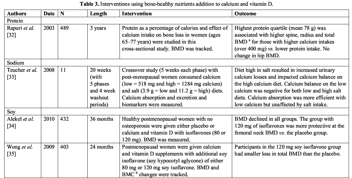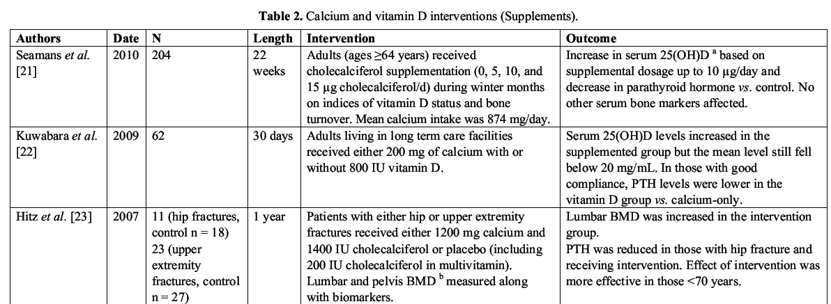 Abstract: Bone health is an important issue in aging. Calcium and vitamin D currently have the most focus in published research on nutrition and bone health in aging, although evidence from published research is not conclusive. A systematic review was conducted to determine the impact of dietary and supplemental interventions focused on calcium and vitamin D over the past 10 years. Using key words to search, and search limits (aging population, English), 62 papers were found related to diet, nutrition, and bone; and 157 were found related to calcium and bone. Our review found a positive effect on bone health for supplements; food-based interventions; and educational strategies. Although there may be a publishing bias related to non-significant findings not being published, our results suggest the effectiveness of food based and educational interventions with less economic impact to the individual, as well as less risk of physiological side effects occurring.