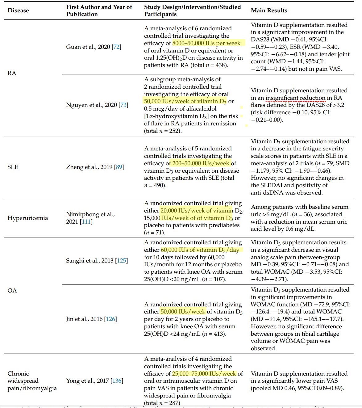 - Rheumatoid Arthritis pain reduced by vitamin D (monthly or daily)