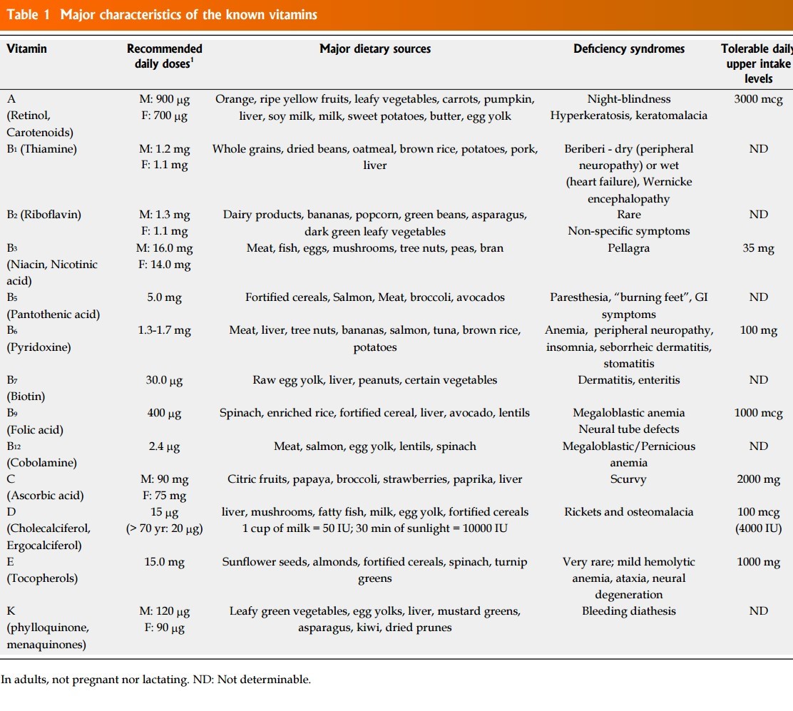 Given the vast literature to be covered, this review will mainly focus on high-quality studies, concentrating in particular on interventional and randomized controlled trials (RCT) of clinical relevance that address the potential preventive and therapeutic role of dietary or supplementary vitamins in various gastrointestinal diseases. Table ​Table11 summarizes the major characteristics of the known vitamins, including their recommended daily doses, major dietary sources and known deficiency syndromes.